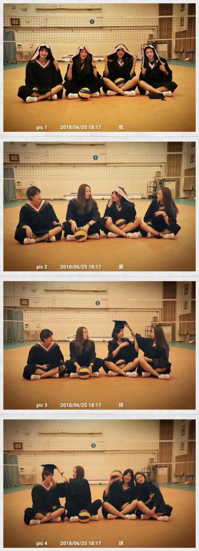 采访当天正好遇到穿着学士服拍完毕业照回来的大四队员。四位即将本科毕业的女排队员们也太好看了吧!我们选取了一位代表——在队内担任自由人的乔琳接受我们的采访(下图左二)。